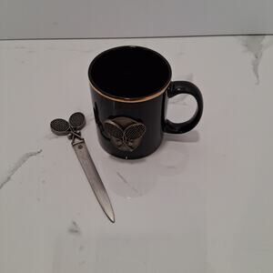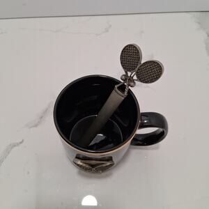 This unique office gift set features a tennis-themed design, perfect for the tennis enthusiast in your life. The set includes a stylish mug and a letter opener, both adorned with a detailed brass tennis racket and ball emblem.