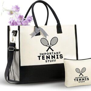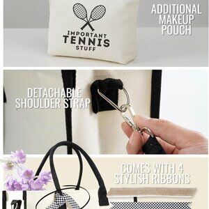 Features: Spacious tote designed for tennis lovers — plenty of room for your laptop, water bottle, and essentials. Secure top zipper keeps everything safe. Includes a zippered pocket inside for valuables and two side pockets for quick-access drinks or umbrella. Comes with a cute, removable makeup pouch and four stylish ribbons to change up the look.