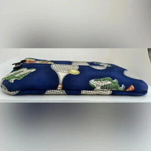 Tennis, tennis racquet, tennis shoes, tennis ball, water bottle- printed on fabric bag. 2- zippered closure pockets on the front. 1- full zippered closure top. Perfect bag for your keys, cards or cash- for that tennis lover. Well made bag. Very good, used condition.