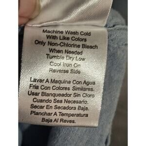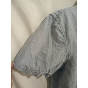 Casual linen blend button-down from Tenth & Ocean in size large. Made from a linen and cotton blend this shirt is a sky blue and features short sleeves with a collared neckline. There is one chest pocket on the left hand side of the chest. The chest measurement is about 44 in. From the shoulder to the hem measures about 27 in.