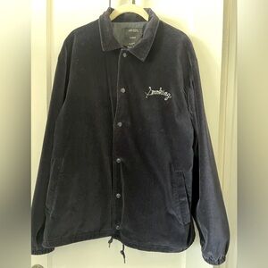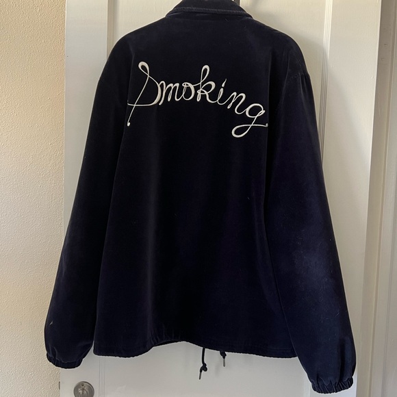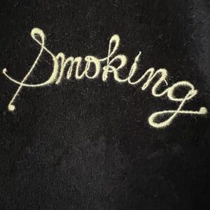 100% Cotton, outer lining has a soft almost chordaroy/suede feel. ‘Smoking’ stitched on front and back. Snap front.