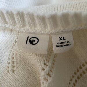 Details: Dropped scoop hem, jersey knit, pointelle design across chest and bottom, ribbed neck band, hem band, and cuffs