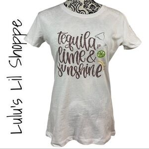 “Tequila, lime and sunshine” in dark pink glitter lettering