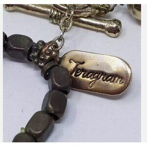 Teragram artisan handmade square and oval metal bead and glass bead stretch necklace with gold tone metal tassel and toggle closure.