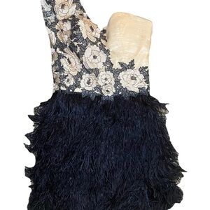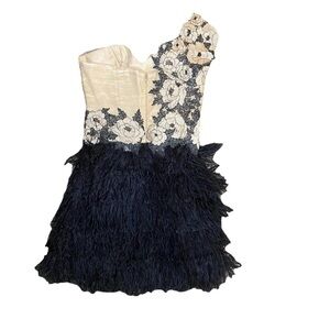 Terani Couture Black/Nude Feather & Floral With Beaded Detail One-Shoulder Cocktail Dress - Size 4