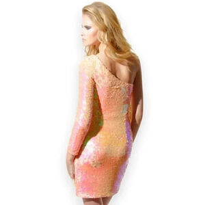 Sequins take on a new meaning in this short and elegant Terani H1906 cocktail dress. This stunning creation has an asymmetrical neckline and a single long sleeve for a hip and chic effect. Covered and coated in a striking array of sparkling iridescent sequins, this fascinating look will hug your curves to the mid-thigh hemline producing a style that will glitter all night. This Terani design will make sure you turn heads all night long.