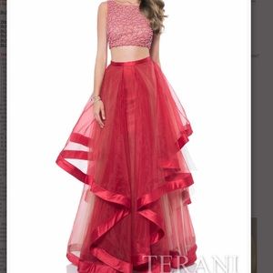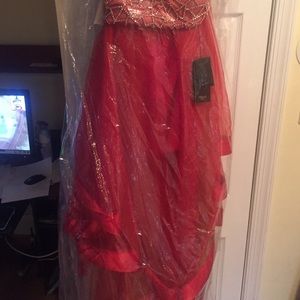 Never Worn !! Two piece prom dress ensemble featuring a crystal embellished illusion midriff top. This prom gown is finished with a sheer, gathered mesh skirt with ribbon accented high-low hemline.