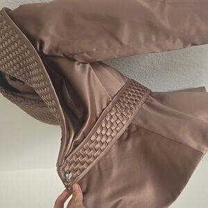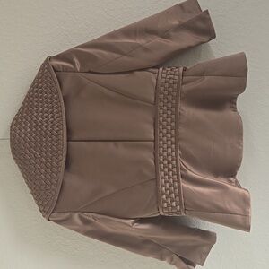 Terani taupe blazer and strapless midi dress set. Perfect for formal occasions. Blazer has textured collar and waistline with accented shiny closure details. Dress is flattering with textured front waistline and heart neckline, also has convenient inside strap for more stability.