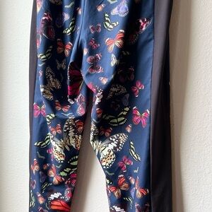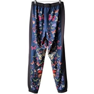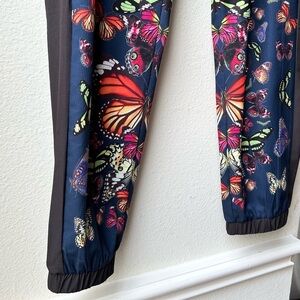 Terez kaleidoscope butterfly joggers! Multi colored joggers designed with a whimsical symmetrical butterfly design on a dark blue backdrop, and solid black panels at the sides. Tapered fit with elastic waist and cuffs and pockets on the side. Polyester/ spandex ripstop fabric, water resistant, sleek and silky.
