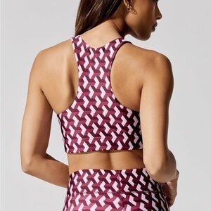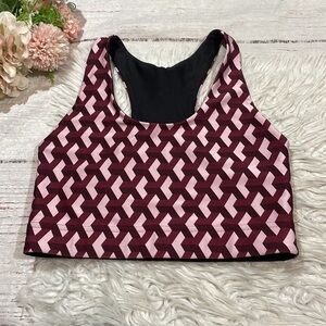 Terez raspberry and pink colored geo patterned hi shine racerback sports bra. This sports bra is in great used condition
