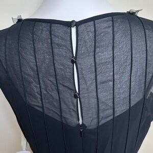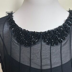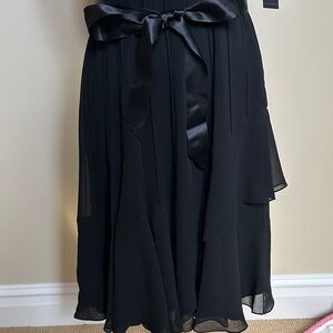 Chic black midi dress with a beaded neckline. Features a satin waist tie and layered skirt.