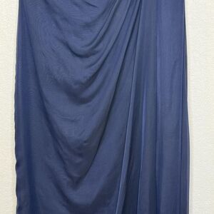 Flowy, draped, floor-length silhouette in a rich navy blue