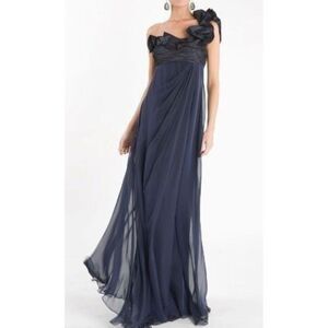 Teri Jon Evening Gown Womens 8 Navy Blue Silk One Shoulder Ruffle Formal Dress