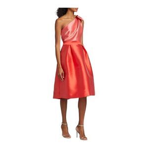 Teri Jon by Rickie Freeman's cocktail dress is crafted of a luxurious silk blend and boasts a satin finish. This colorblocked piece is styled with a one-shoulder neck, full pleated skirt, and bow accent.