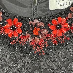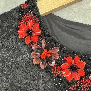 Color/Pattern: Black jacquard with tonal paisley texture; red floral beaded/applique neckline