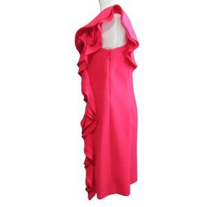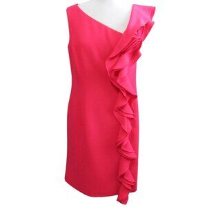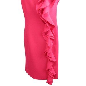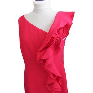 Teri Jon Rickie Freeman women's hot pink front ruffle cocktail dress with asymmetrical neckline.