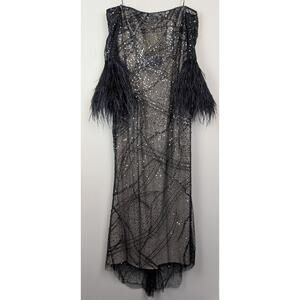 Stunning Teri John Rickie Freeman dress. 2024 collection. Sheer overlay with sequins. Feather adorned sleeves (feathers are black with slight hue variations). Lined. Zips in back.