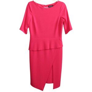 Teri Jon Rickie Freeman women's hot pink sheath dress with asymmetric peplum and front slit.