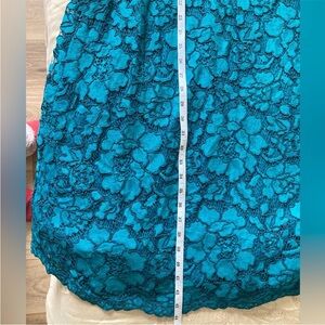 This elegant teal lace dress is perfect for special occasions. The intricate lace design adds a touch of sophistication. Ideal for your child's wardrobe. Step out in style with this elegant teal lace dress. Perfect for any occasion, this dress combines sophistication with comfort. In EXCELLENT CONDITION.