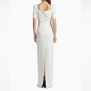 Crafted of crepe, this Teri Jon by Rickie Freeman gown is styled with a square neck and embellished with floral appliqué.
