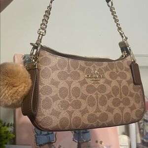 Like new teri shoulder bag in brown. Charm included. Crossbody strap still wrapped up.
