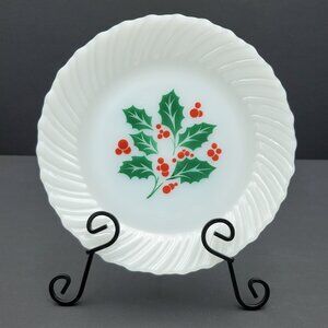 Termocrisa Holly Berry White Milk Glass Christmas Dessert, Appetizer, Cookie Plates - Set of 4. Excellent pre-owned condition. 7" milk glass plates with a swirled edge and holly leaves & berries holiday pattern.