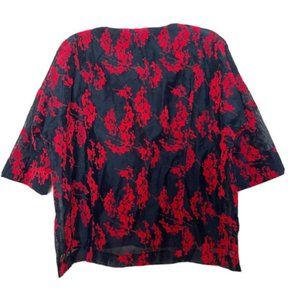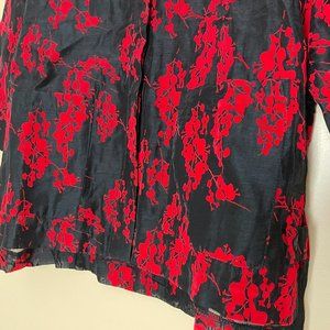 65% silk and 35% polyester with red flocked floral print on semi-sheer black background