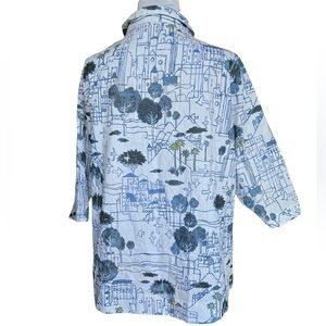 Terra SJ Apparel women’s button front top with blue cityscape print. Made from breathable 100% cotton for comfort and easy care. Features a wired collar that can be styled flat or popped, 3/4 sleeves, and a relaxed fit. Size Small. Excellent pre-owned condition.