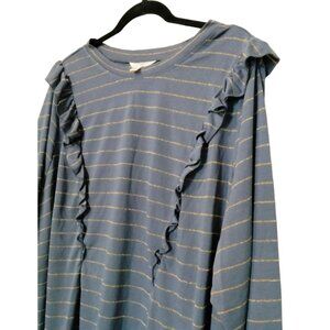 Terra & Sky 3X Long-Sleeve Blue Top With Gold Stripes Ruffle Accents