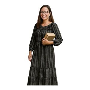 Step into effortless comfort and flattering style with this Terra & Sky black and gray striped maxi dress in size 14W (1X). Designed with stretch and flow, it features a gathered elastic neckline with tie detail, long sleeves with ruffled elastic cuffs, and a comfortable smocked waist for a great fit.