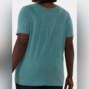 Bundle of three shirts for women . One navy blue , black and green Experience ultimate comfort with Terra & Sky's relaxed high low t-shirts, available in classic black and refreshing green. These short sleeve tees are perfect for casual outings, offering a simple yet stylish look with their clean design and soft knit fabric.