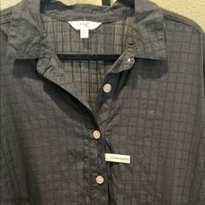 Elegant black dress with textured fabric. Features a button-up front and short sleeves.
