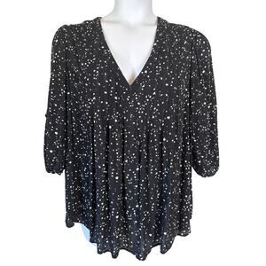 Terra & Sky Black White Speckle Plus Sz 2X Peasant Blouse 3/4 Sleeve V-Neck Boho