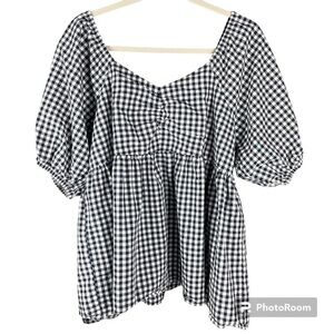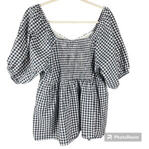 Gingham blouse by Terra & Sky. Short bell sleeves with elastic. Elastic at bust and back, plenty of stretch. 100% Cotton