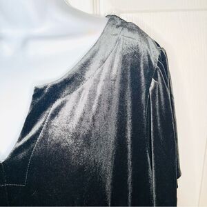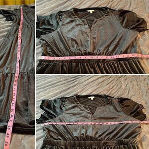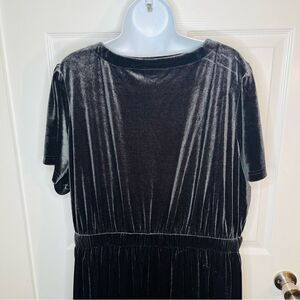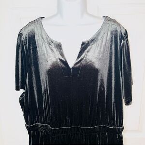 Terra & Sky Charcoal Grey Black Tiered Ruffled Velvet Midi Dress 2X. Midi dress with a split V neck, flutter sleeves, and tiered for romantic silhouette. Color is called black soot and is a dark grey to black color. This lovely VNeck Velvet Midi Dress from Terra & Sky is the perfect choice for any occasion. The flirty flutter sleeves and tiered skirt add just the right amount of feminine details. Enjoy the comfort and figure-flattering elastic waistband while the V-neckline accentuates your beautiful collarbone. Added bonus, side seam pockets to hold your essentials on the go. Style with your favorite sandals to complete the look! Gently used Excellent Preowned Condition.