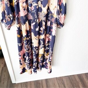 DETAILS: Terra & Sky dress women's 2X, navy blue with floral bird print, peasant maxi style. Polyester, machine wash.
