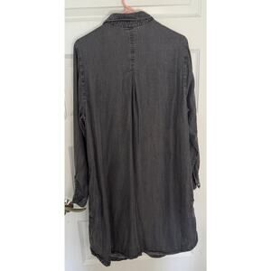 This Terra & Sky shirt dress offers the perfect blend of comfort and casual chic. Crafted in a soft gray chambray-style fabric, it features long roll-tab sleeves, snap-button front closure, dual chest pockets, and a gently curved hem. The versatile design allows you to wear it as a dress or long tunic with leggings. Size 0X (14W), made in China. In excellent pre-owned condition with no visible flaws.