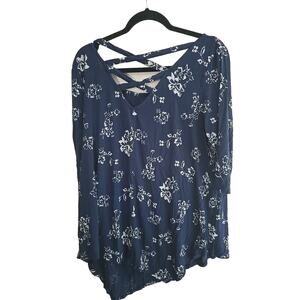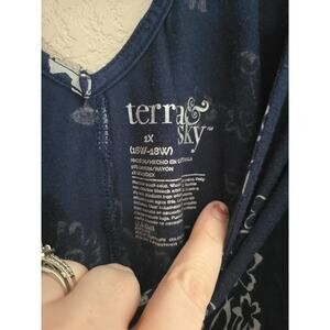 Terra & Sky Navy Blue Floral Print Asymmetric Hem Short Sleeve Top Womans Sz 1X. Pre-owned