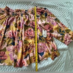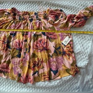 Terra & Sky Off the Shoulder Floral Blouse Women's Chic off-shoulder blouse with vibrant floral design. Features pink and gold hues Elegant blouse with pink and yellow floral pattern. Ideal for a fashionable outfit.