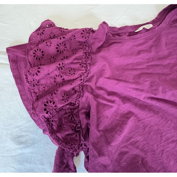 This stylish women's top by Terra & Sky is designed for comfort and style. In a rich purple hue, it features intricate eyelet ruffle sleeves, adding a touch of elegance to any ensemble. Made from a soft cotton blend, this plus-size top offers a flattering fit and breathable wear.