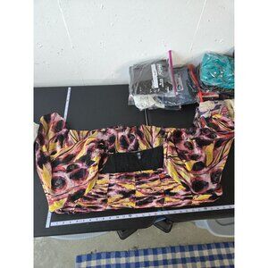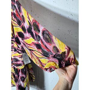 sustainable recycle multicolor colorful top shirt blouse print pattern vibrant bright long sleeve sheer see through curvy fall winter spring ruched purple yellow date night going out club party feminine stretch