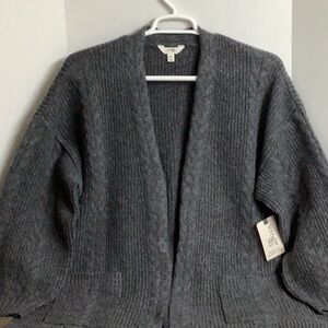 Stay cozy and stylish with this gray open front cardigan sweater. The cardigan features a cable knit/textured knit pattern with convenient front pockets.