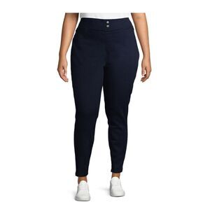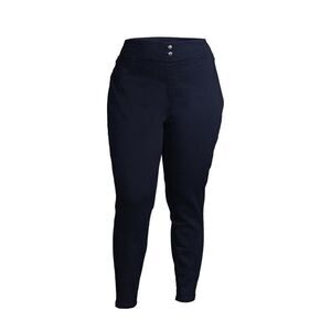 •Material: 78% Cotton/21% Polyester/1% Spandex •Care: Machine washable •Country of Origin: Imported :Size: Model is 511" and is wearing a size 1X •Fit: Slim ‣Rise & Inseam: High rise; 28" inseam •Closure: Pull-on styling with double button detail •Pockets: Two faux front and two back pockets ‣Features: Tummy-control panel; stretch denim fabric