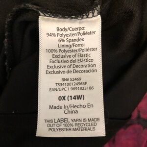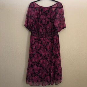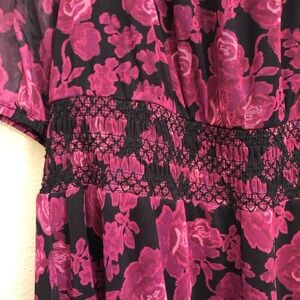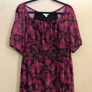 Terra & Sky Women's OX 14W Rose Floral Black/Burgundy Sheer Dress w/ inner lining. In pre-owned but excellent condition. Approximate measurements: pit to pit 19 inches. Length from waistline to bottom hem 25 inches.