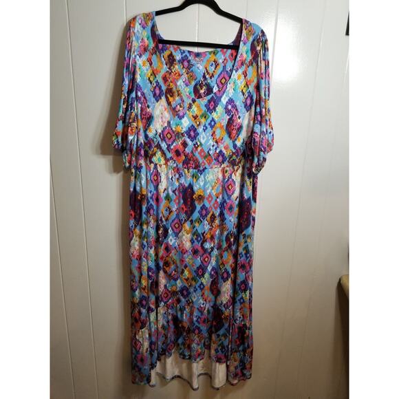 This Terra Sky maxi dress in 2XL (20/22) features an abstract tribal pattern with short balloon sleeves and a scoop neck. The stretchy knit fabric is made of spandex and rayon, making it comfortable for travel or casual occasions. It also works for Holy Communion or business events. The dress has pockets and a pullover closure. The multicolor dress has a vintage-free and plus size type. The dress falls long, making it perfect for summer, fall, or spring. The dress is made in Jersey, with no mention of its condition. Shoulder to hem 56"