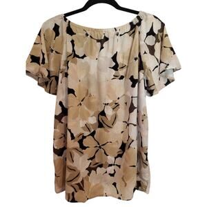 Terra and Sky Tan Black Floral Linen Blend Peasant Blouse Ruffle 0X 14W