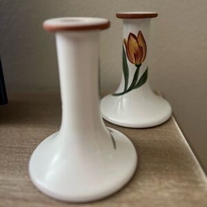 Excellent condition candle sticks set of 2 terracotta with white finish glossy with flower on each. No chips or cracks