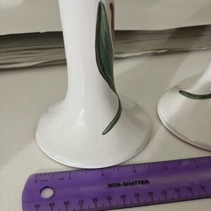 Excellent condition candle sticks set of 2 terracotta with white finish glossy with flower on each. No chips or cracks