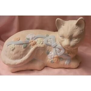 Terracotta Ceramic Cat Figurine With Roses and Bow
