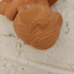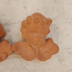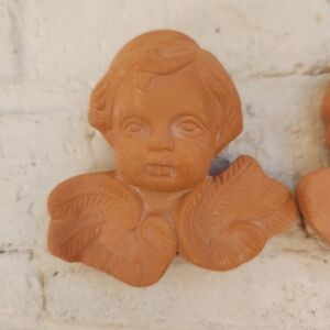 Pair of terracotta cherub wall decor pieces. Features intricate leaf details. Approximately 3.5x4